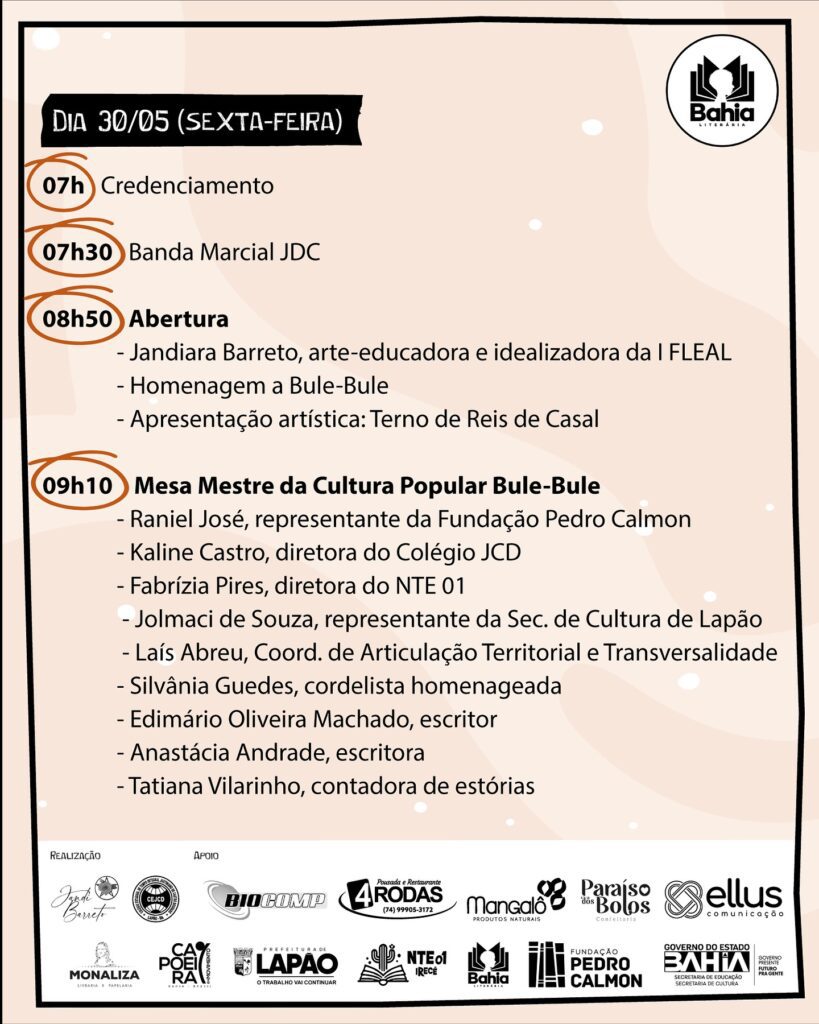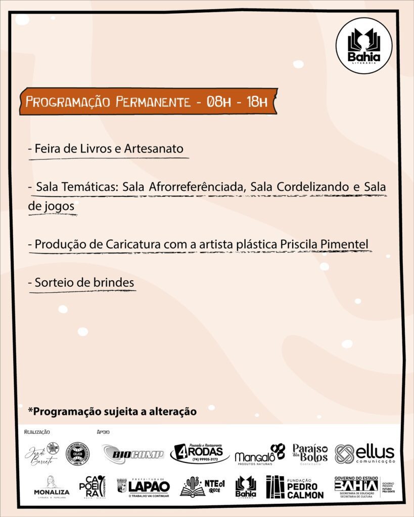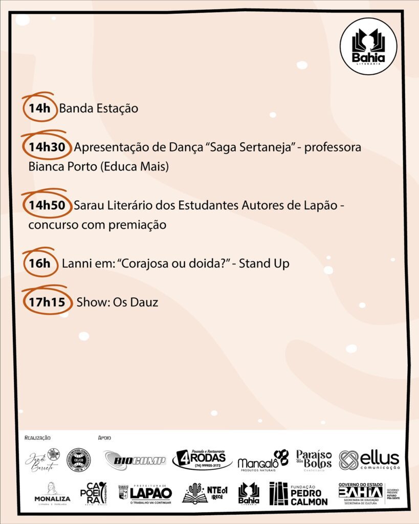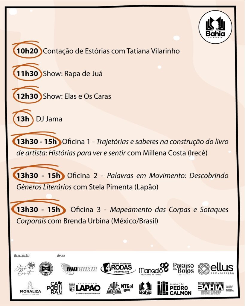 Este projeto foi contemplado no Edital de Apoio às Festas, Feiras e Festivais Literários (N° 01/2024), através do Programa Bahia Literária, com o apoio financeiro do Governo do Estado da Bahia, através da Secretaria de Educação e Secretaria de Cultura, via Fundação Pedro Calmon, direcionada na modalidade fomento à execução de ações culturais, de acordo com o Decreto Federal nº 11.453/2023, a Política Estadual de Cultura – Lei nº 12.365/2011, o Plano Estadual de Cultura – Lei nº 13.193/2014, o Plano Estadual de Educação da Bahia – Lei Estadual nº 13.559/2016, a Lei Federal nº 14.133/2021.